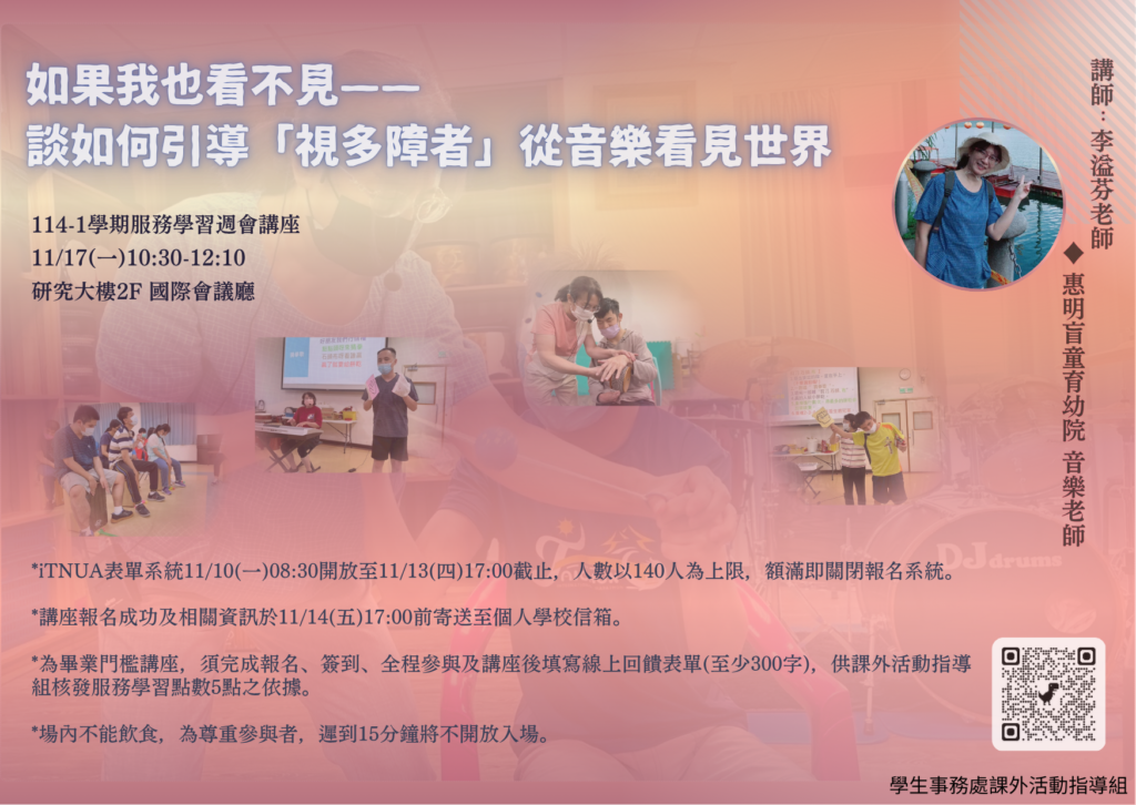 簡介資源下載FAQ國立臺北藝術大學服務學習實施辦法國立臺北藝術大學服務學習施行細則服務學習委員會會議紀錄國際關懷 課指組首頁北藝大首頁 關心焦點 服務學習點數可於iTNUA查詢!新教學務系統>>學務相關>>服務學習 個人校外 iTNUA>>服務學習>>填寫個人校外服務申請>>填好印出核章(最晚服務前一週繳至課指組) 服務學習課程 服務學習活動 服務學習講座**114-1學期講座(11/17):如果我也看不見** 每學期一場;可於iTNUA表單系統報名;即時訊息可參考課指組粉絲頁 *仍有疑惑請洽課外活動指導組分機: 1325 相關計畫教育部青年發展署相關補助計畫教育優先區中小學生營隊活動要點臺北市政府青年局法藍瓷想像計畫中租青年展望基金會中租愛心社團補助辦法暑假服務| 財團法人全聯佩樺圓夢社會福利基金會國泰卓越獎助計畫財團法人永長興社會福利慈善基金會信義房屋股份有限公司2025社區一家計畫社團法人千佛山慈善基金會國際志工青年赴以色列參加以色列社福部國際志工計畫相關說明微客國際志工活動VYA國際工作營2026聯合國『國際志工永續發展年』行動計畫