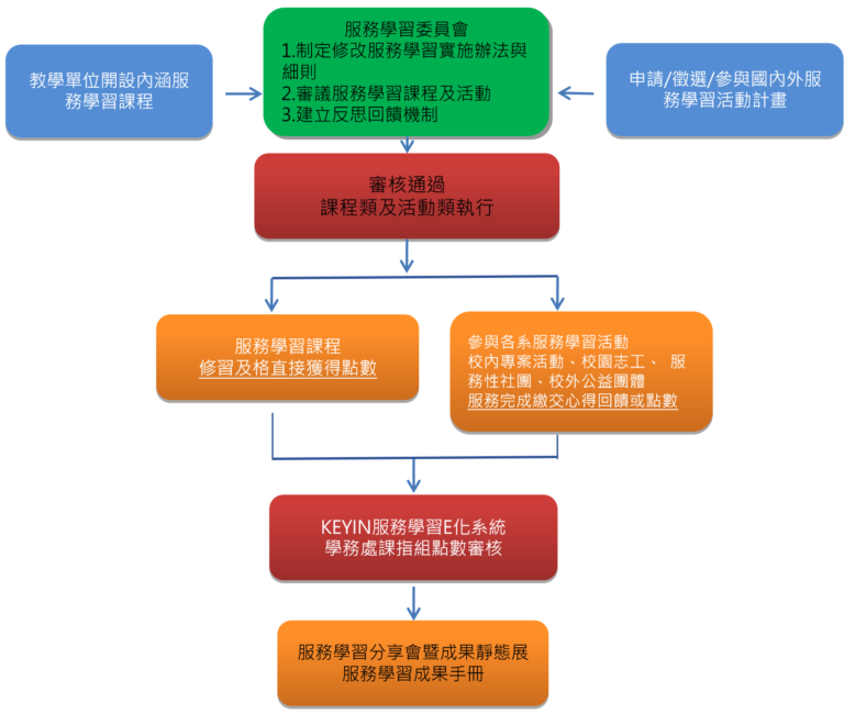 本校規劃辦理「藝術專業服務學習計畫」,以結合各系所的專業藝術,將原本內涵服務學習精神之課程正式開設納入教務處具服務學習內涵課程。從97學年度開始實行計畫分成三個部份,由「服務學習課程推動小組」執行「藝術服務學習課程推動與培訓」計畫以規劃服務學習相關研習會來培養種子教師為目的,並邀請志工服務相關學者或有經驗之藝術工作者來校專題講座,以宣導服務學習概念;亦可培養師生對於服務學習設計方案與成效評估之能力。再由教學單位開設服務學習內涵課程,主要針對不同年齡層的服務對象,利用藝術專業單位展演實習的機會,以達到執行服務學習之實。